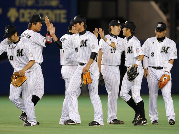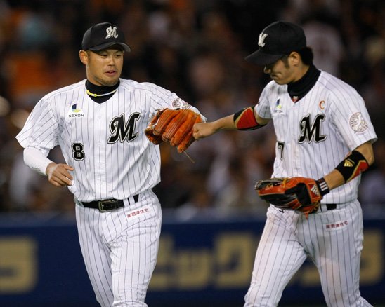 8番 里崎 遊ゴ 2-1からの4球目、インコース低めへのスライダーを打った打球は、ショート・坂本の正面をついてしまった。2塁ランナー・福浦は3塁を狙うも、二三塁間に挟まれてしまいタッチアウト。打った里崎は1塁に残った。 |