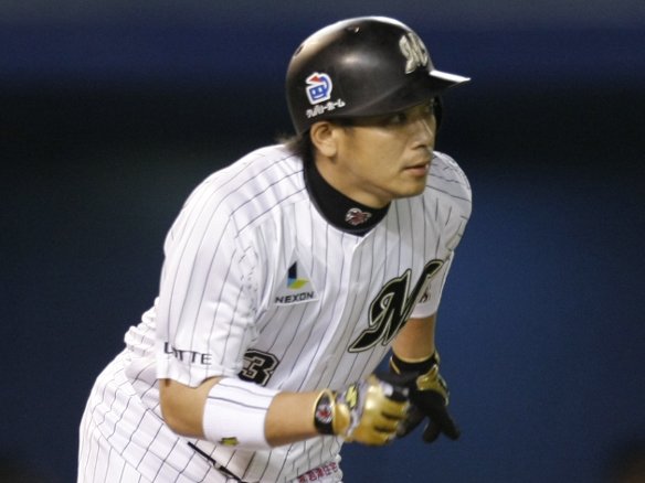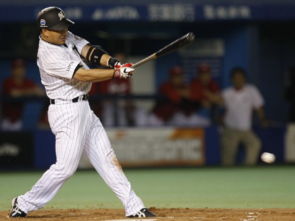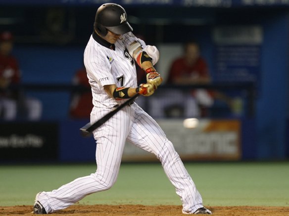 6番 サブロー 右越二 2-1からアウトコース真ん中のストレートを弾き返し、大きな当たりとなった打球は右中間フェンスを直撃した! 3塁ランナー・井口、2塁ランナー・金泰均が相次いで還り7対5!! 勝ち越しに成功! 打ったサブローは2塁へ! ![]() 7