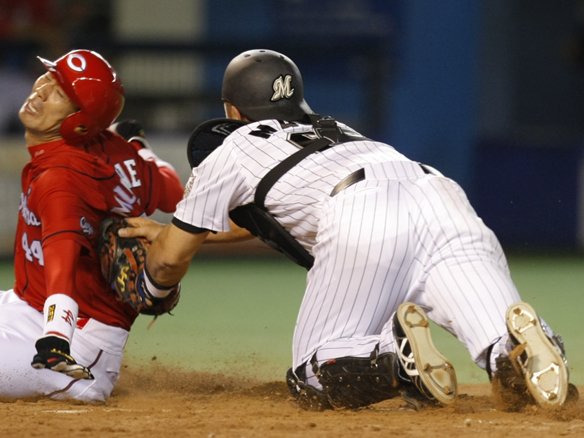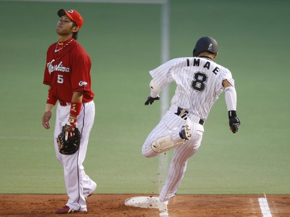 3番 嶋 四球 2-2から1塁ランナー・梵がスタート。キャッチャー・里崎の送球はワンバウンドとなって2塁ベースに到達したが、梵の足の方が先に2塁ベースへたどり着いた。盗塁成功。 |