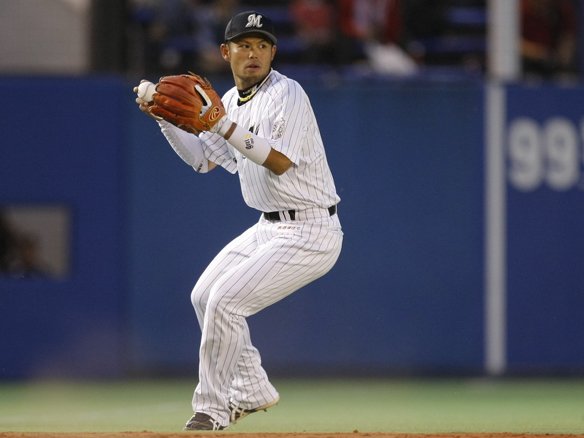 2番 梵 二ゴ 1-0からアウトコースのチェンジアップを打たせた打球は、セカンド・井口が正面で捕球し1塁に送球した。 |