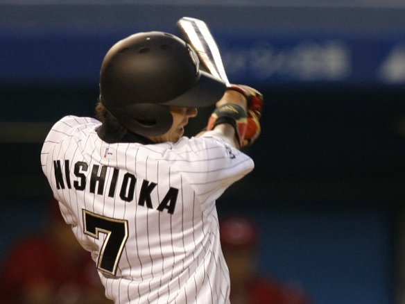 3番 嶋 右翼二 1-1から1塁ランナー・梵がスタート。キャッチャー・里崎が2塁に送球するが2塁ベースの前で跳ねショート・西岡がボールを後逸。その間に梵は3塁に進んだ。記録は盗塁と里崎のエラー。 ![]() 2