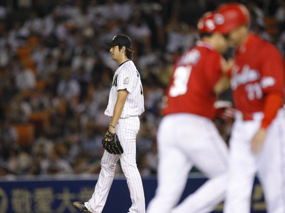 4番 前田智 1-1から真ん中低めのストレートを振り抜かれ、打球は大きな当たりとなりフェンスを直撃してしまった。3塁ランナー・東出、2塁ランナー・梵が相次いで還り7対7の同点・・・。打った前田智は2塁へ。 ![]() 7