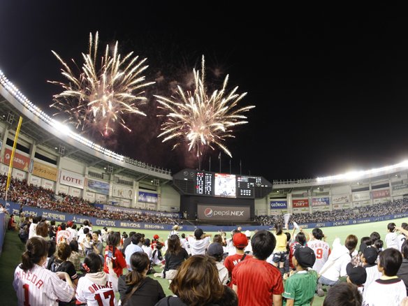 金泰均に16号ソロが飛び出し、1点差に詰め寄りました! 5回を終えて千葉マリン上空には花火が舞い上がります! ここから一気に反撃して試合をひっくり返し、千葉マリン不敗神話を伸ばしていきましょう! |