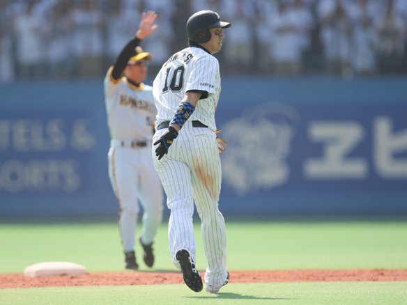 投手 藤川 8番 竹原 中越二 初球のアウトコース低めへのストレートを弾き返すと、鋭い打球がセンターへ。これをセンター・平野が後ろに下がるも打球をつかめず! 1塁ランナー・サブローがホームインして2対4! ![]() 2