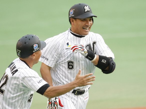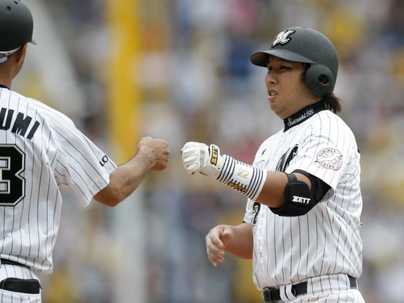 里崎は右翼フェンス直撃の安打を放ち諸積コーチとグータッチ