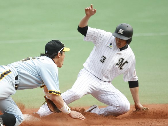 1番 鳥谷 二ゴ 1-0からのアウトコースへのボールを引っ掛けさせ、セカンド・井口が2塁ベース横でこれを捕球し2塁ベースカバーのショート・西岡に送球しアウト。西岡は1塁に送球するもセーフ。 |