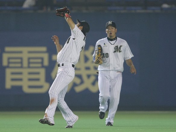 8番 日高 三邪飛 2-3からの7球目、アウトコース高めのカーブでタイミングを外して打ち上げさせた打球は、ファールグラウンドで猛ダッシュを見せるサード・今江が懸命のランニングキャッチ!! 3塁ランナー・セギノールは塁上で釘付け!! |