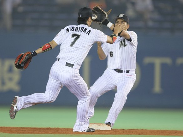 2番 今江 ゴ 初球、アウトコースのストレートを引っ掛けた打球はショート・大引の正面に転がると、大引は大きく弾いてしまったが、2塁ベース付近に転がるところをセカンド・後藤が2塁を踏みながら拾い上げ、1塁ランナー・西岡はフォースアウト。しかし、1塁への送球より先に今江が1塁を駆け抜けた。 |