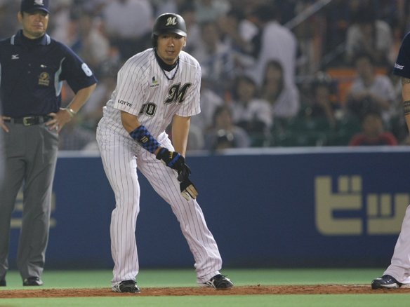9番 岡田 二ゴ 2-1からの4球目、アウトコース低めのフォークボールを引っ掛けた打球はセカンド・後藤の正面へ。2塁へすばやくバックトスされて、1塁ランナー・福浦はフォースアウト。しかし、ショート・大引からの送球よりも早く打った岡田が1塁を駆け抜け、ランナーが入れ替わる形になった。 |