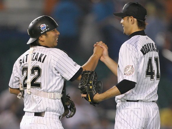 試合に幕を下ろした守護神・小林宏は里崎と笑顔で握手!