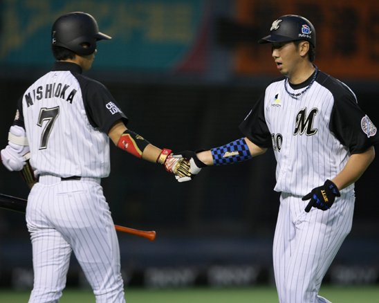 四球で出塁し生還した大松は西岡とタッチを交わす!