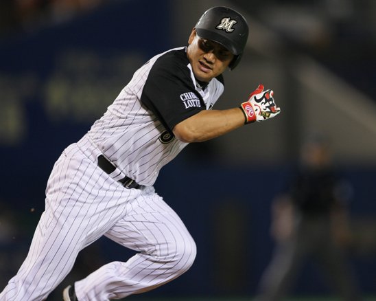 4番 金泰均 一ゴ 初球、真ん中高めのストレートが、止めたバットに当たってファースト・ペタジーニの正面に転がった。すばやく2塁に送球されて1塁ランナー・井口はフォースアウト。しかし、1塁への送球よりも金泰均が先に1塁を駆け抜けて、走者が入れ替わった。 |