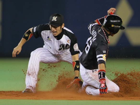 1番 川崎 二ゴ 0-2からアウトコース高めのストレートを引っ張られた打球は、セカンド・井口の正面をついた!! |