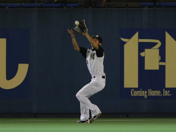 4番 金泰均 左飛 初球、真ん中のスライダーをとらえた打球はレフト・オーティズの頭上を襲ったが、ドライブ回転がかかり、半身の体勢でグラブを伸ばしたオーティズにフェンス手前でキャッチされてしまった。 |