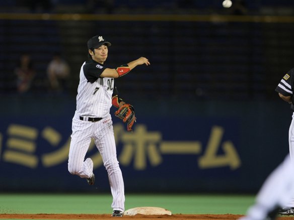 1番 西岡 遊ゴ 2-1からの4球目、アウトコース低めのシンカーで泳がされ、三遊間に引っ掛けてしまった打球は、ショート・川崎が捕球して2塁へ送球。1塁ランナー・的場がフォースアウト。しかし、1塁へは送球されず、西岡が1塁に残る形になった。 |