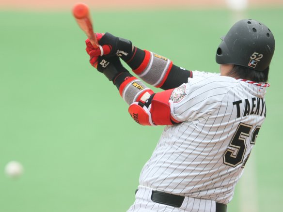 4番 金泰均 左越安 2-2からの5球目、インコース高めへのストレートを思い切り引っ張ると、強烈な打球が三遊間を襲った! サード・原がダイビングキャッチを試みるもボールは勢いよくレフトへと抜けていき、フェンスまで到達。1塁ランナー・井口は3塁へ進塁し、打った金泰均は1塁でストップ。 |
