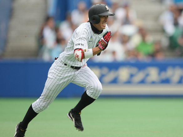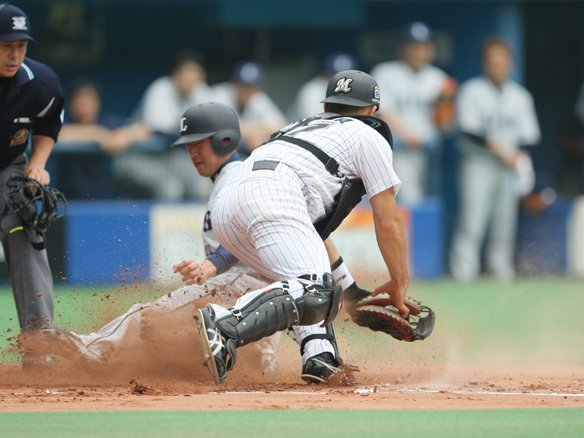 7番 平尾 右安 0-2からアウトコース高めへのストレートを流し打たれ、ファースト・金泰均がダイビングキャッチを試みるも、ボールはミットをすり抜けてライト・サブローの前へ。1塁ランナー・高山を刺すべくサブローからサード・今江に送球されたボールを今江が前に出ながら捕球し、2塁を陥れようとした平尾を刺そうと2塁ベースカバーに入った井口に送球するも、あと一歩間に合わず。 |