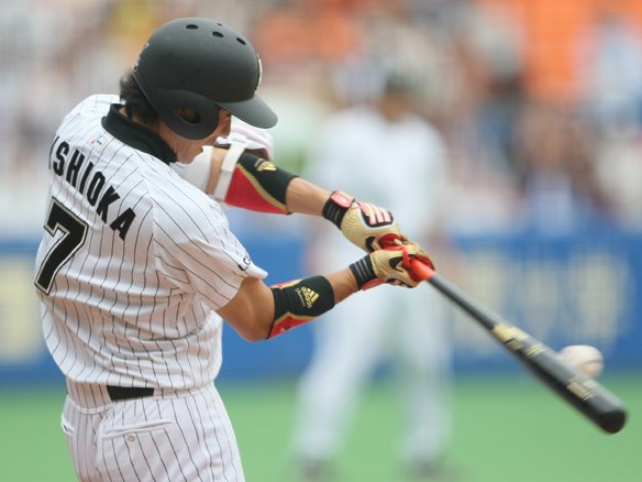 投手 マーフィー 1番 片岡 右安 2-2からファールで粘られた後の7球目、低めに投じたカーブにうまく合わされてしまい、糸を引くようなライナー性の打球がライト・サブローに前で弾んだ。 |