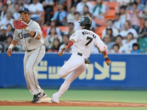 7番 神戸 一ゴ 初球のアウトコースへの変化球を引っ掛けてしまい、ファースト・フェルナンデスに回り込まれそのまま1塁を踏まれた。 |