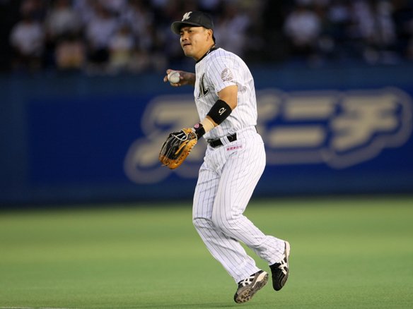 1番 西岡 中安 2-2からの7球目、真ん中へのストレートを弾き返すと、ショート・中島の横を抜けセンター前へ飛んでいった。2塁ランナー・里崎は打球が二遊間を抜けるのを確認してからスタートし3塁でヘッドスライディングしセーフ。 |