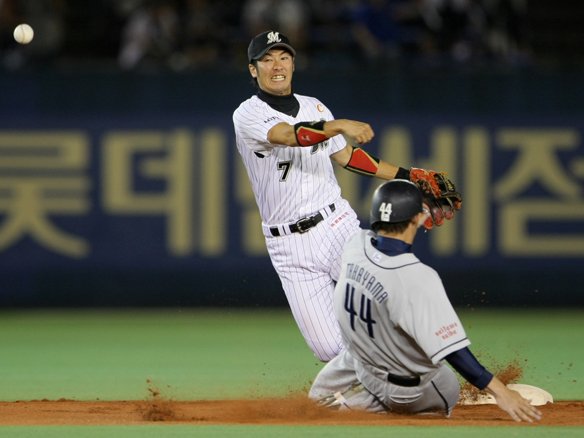 5番 ブラウン 一ゴ 0-1からのアウトコース低めへのボールに食らいつかれると、ファースト・金泰均が打球をつかみベースカバーに入ったピッチャー・マーフィーに送球する間に3塁ランナー・栗山がホームインし8対1。 ![]() 8
