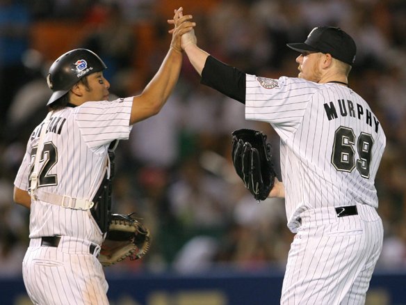 坂田を三振に仕留めたマーフィーは里崎と勝利のハイタッチ!