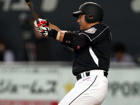 6番 サブロー 左安 2-0からインコース真ん中のスライダーにバットを折られながらも振り抜き、フラフラと上がった打球は前進するレフト・鵜久森の前にポトリと落ちた! |