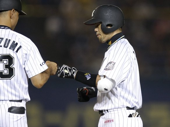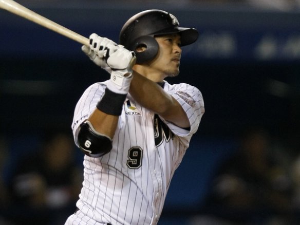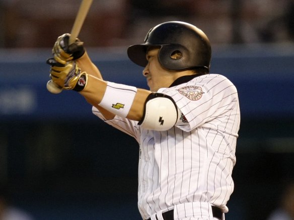 | 6番 松中 左安 2-2からの7球目、アウトコース低めのスライダーで体勢を崩したものの、バットの先で弾き返された打球は、左中間の真ん中に落ちてしまった。 | |