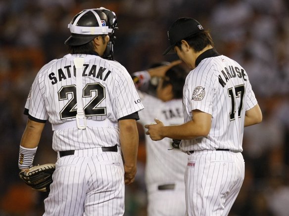 | ここでキャッチャー・里崎がマウンドへ向かうと、ピッチャー・成瀬にもうひと踏ん張りするように声をかけます。 | ||