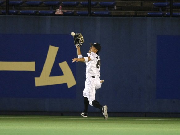 岡田は左中間に飛んだ田上の打球をランニングキャッチ!