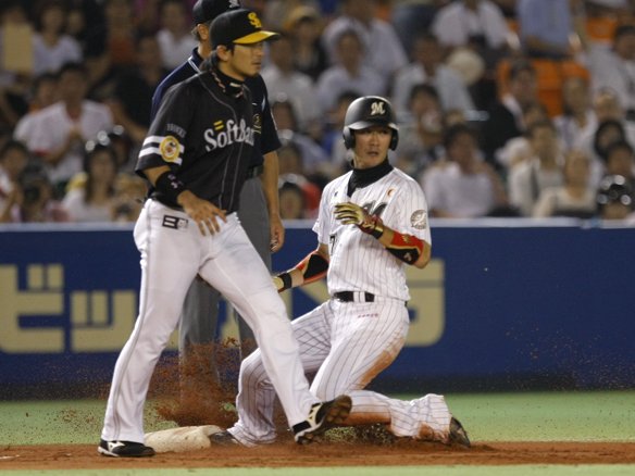 | 3アウト | 8番 里崎 空三振 1-1からの3球目、真ん中低めのスライダーがワンバウンドになり、キャッチャー・田上が1塁側に大きく弾いた。その間に1塁ランナー・大松が2塁に進んだ!! 記録はピッチャー・山田のワイルドピッチ。 | |