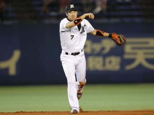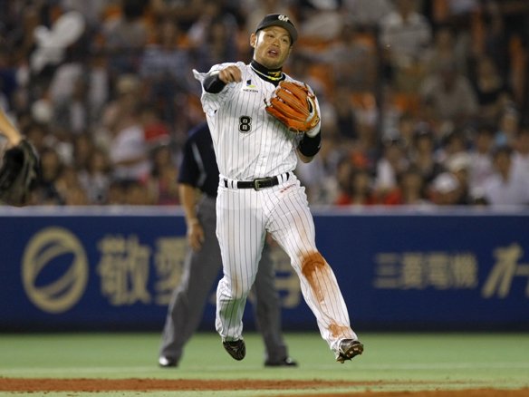 | 9番 田上 中安 初球、アウトコース高めのストレートを強振された打球は低いゴロとなって、追いかけたセカンド・井口が逆シングルで差し出したグラブも及ばず、センター・岡田の前に抜けていった。 | |