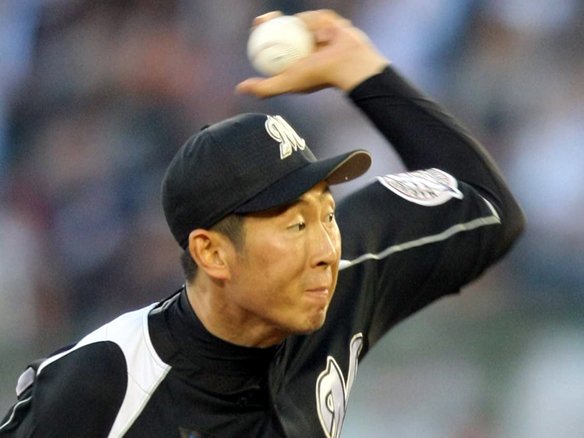 4番 金泰均 左安 2-1からインコースのストレートを鋭く回転して引っ張った打球は、痛烈な当たりとなってサード・バルディリスのグラブを弾き、レフト前に抜けていった! 記録はヒット。金泰均は5試合ぶりのヒットとなった! |