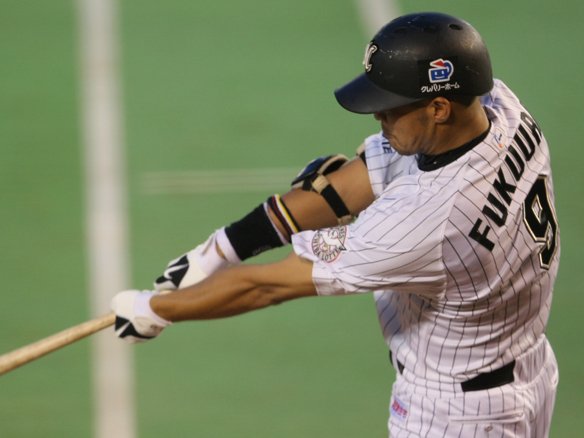 3番 福浦 右中二 0-1から真ん中のストレートをきれいにすくい上げ、大きな当たりとなった打球はそのまま右中間に飛んでいった! 福浦は今日3打数3安打の猛打賞! |