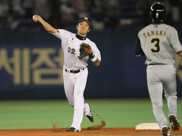 4番 金泰均 遊ゴ 1-2から真ん中のストレートにタイミングを外され、ボテボテのゴロとなった打球はショート・飯山が捕球。2塁ベースカバーに入ったセカンド・田中賢にトスして1塁ランナー・福浦がフォースアウト。 |
