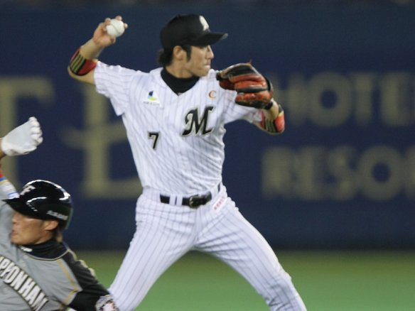 6番 サブロー 投ゴ 初球、アウトコースのストレートを弾き返すが、打球はピッチャー・宮西がワンバウンドで捕球。3塁ランナー・福浦が飛び出したのを見て素早く送球し福浦がタッチアウト。 |