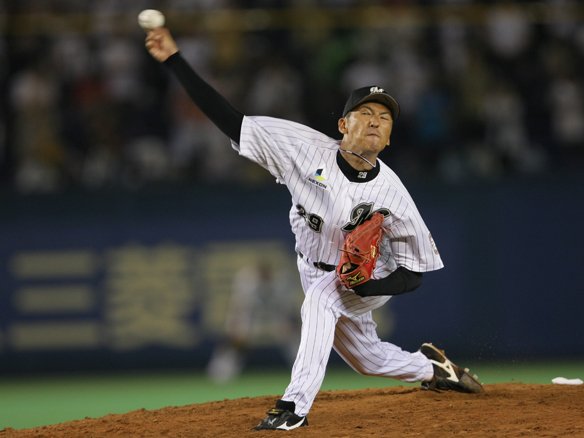 投手 マーフィー 8番 鶴岡 捕邪飛 初球、真ん中高めのストレートを打ち上げさせ、力のないフライとなった打球は1塁ファールゾーンでキャッチャー・的場が落ち着いて捕球した。 |