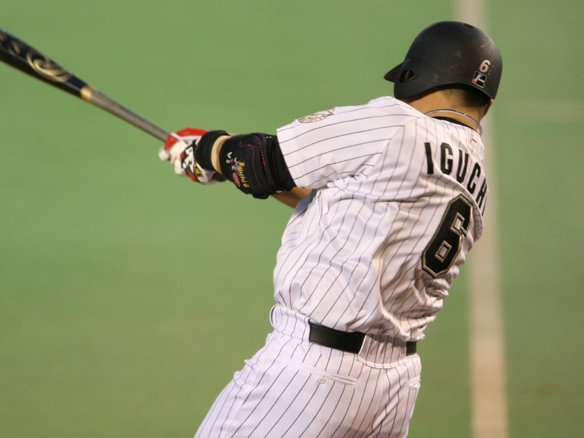 3番 井口 右越二 初球の落ちきらなかったフォークをとらえ、井口らしい右方向への強い打球がライト後方へ飛んでいった! そのままフェンスに直撃し、打った井口は2塁へ進み、1塁ランナー・今江も3塁へ! |
