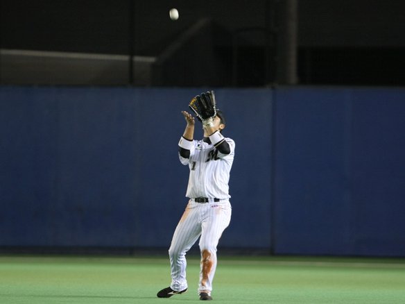 3番 後藤 遊飛 初球のアウトコース寄りのボールを打ち上げさせ、ショート・西岡が正面を向きながら背走していき、左中間の手前辺りでキャッチ! |