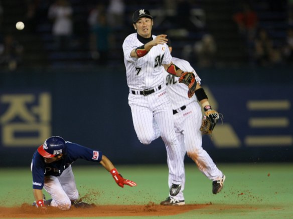2番 下山 二ゴ フルカウントからの6球目、カーブを打たせた打球は2塁ベース方向に飛び、セカンド・井口が逆シングルでの捕球を試みるもボールを落としてしまった。井口は素早くボールを拾い上げ、ファースト・金泰均へ送球して間一髪アウト! |
