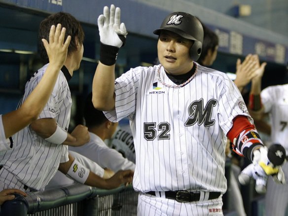やはり頼れる主砲は健在! 残念ながら5回終了後の花火が中止となった千葉マリンでしたが、金泰均が代わりの一発を幕張の夜空に放ち、ついに勝ち越し!! 均衡を破りました!! このままリードを守り切り、4連勝を決める! |
