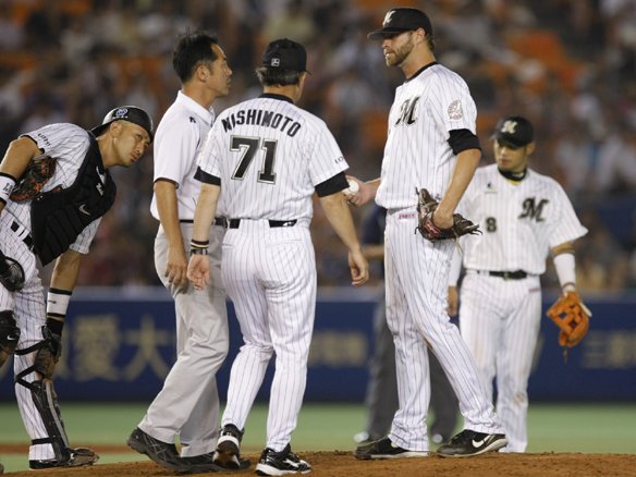 西本コーチがマウンドに向かいペンに声を掛ける