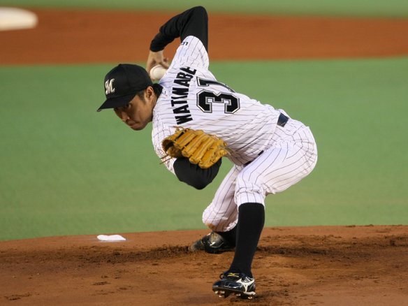 投手 渡辺俊 投手 渡辺 4番 中村 左安 2-2からの5球目、アウトコース高めへのカーブを打たれると、打球は三遊間の真ん中を抜けてレフト・大松の前へ。 |