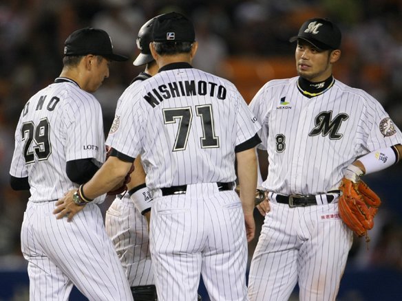 投手 小野 投手 小林宏 【千葉ロッテ選手交代】 ピッチャー・小野→小林宏 ライト・サブロー→センター・岡田 センター・清田→ライト |