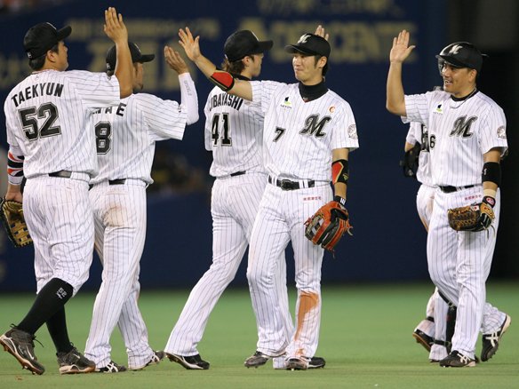 小野は先頭の片岡にデッドボールを与えて出塁させると、敵の決死の攻撃に晒されて同点に追いつかれてしまいました。しかし、まだ試合が終わったわけではありません! 何度も劣勢をはねのけてきた打線の勢いで勝ち越し点を奪いましょう!! 最後に笑うのはマリーンズ!! |