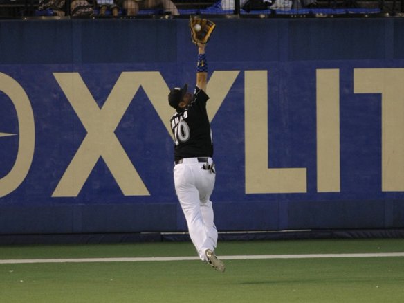 大松は栗山の打球を追いかけジャンピングキャッチ!