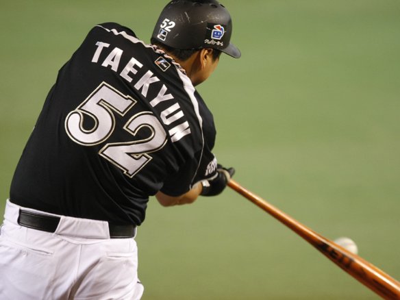 金泰均はスライダーを振り抜くが中飛に倒れる