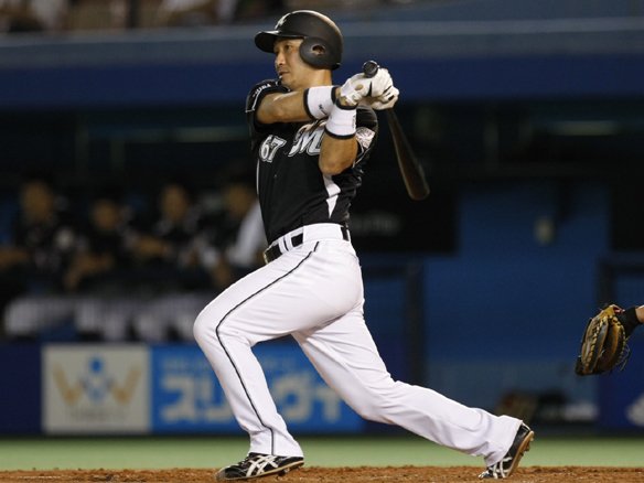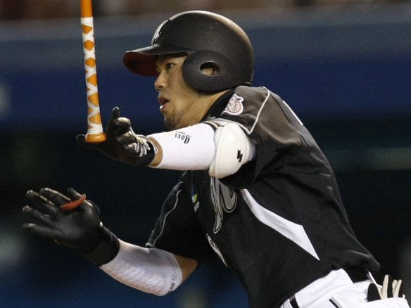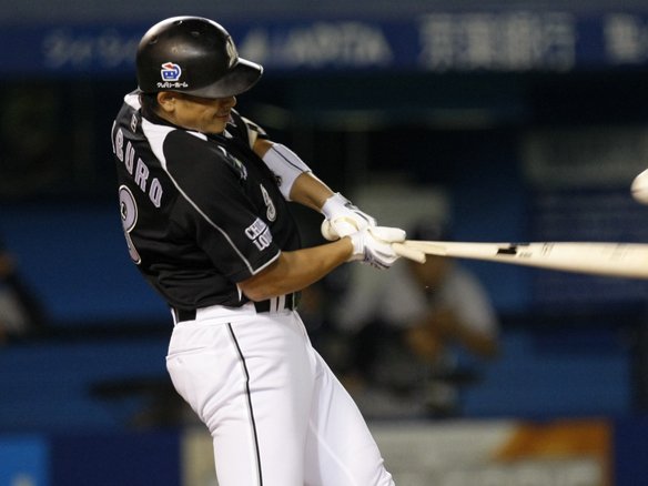 投手 西口 6番 サブロー 左安 フルカウントからインコースのストレートを振り抜き、打球は詰まりながらもしぶとくレフト・大島の前に落ちた! |