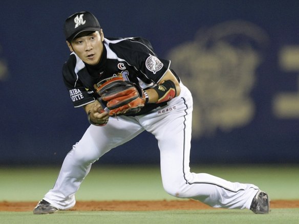 中島のゴロを捕球した西岡はベースカバーに入る井口へトスする