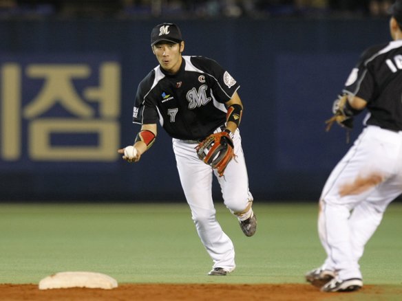 8番 上本 一ゴ 初球、真ん中のチェンジアップを振り抜かれるも、一二塁間に飛んだゴロをファースト・金泰均がキャッチ。1塁ベースカバーに入ったピッチャー・唐川にトスをしてアウトに仕留めた! |